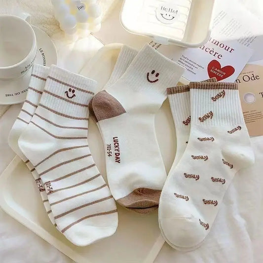 5 Pairs Women's Cute Smiling Mid Tube Print Socks Comfortable And Soft Round Neck Sports Socks Stockings